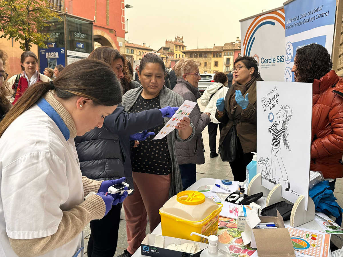 Amb motiu del Dia Mundial de la Diabetis els professionals de l’Hospital Universitari de Vic i de l’Atenció Primària van participar, aquest divendres, en la jornada de conscienciació sobre la diabetis a la plaça Major de Vic.